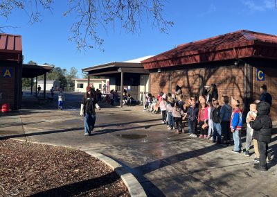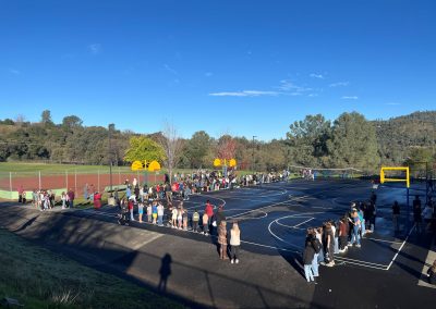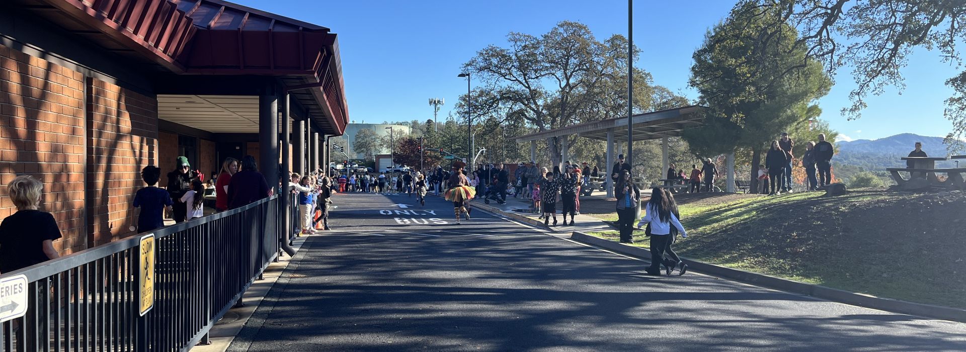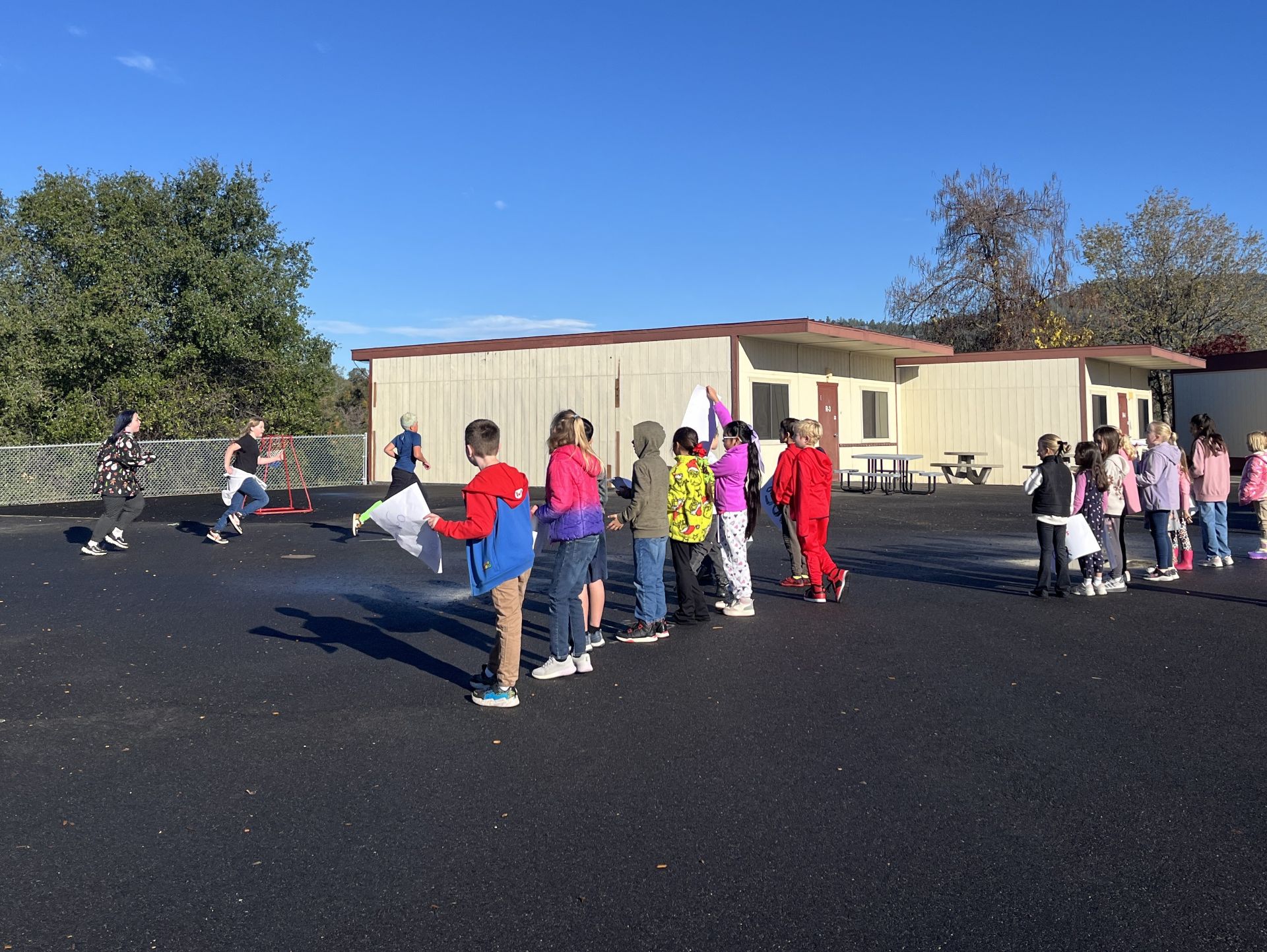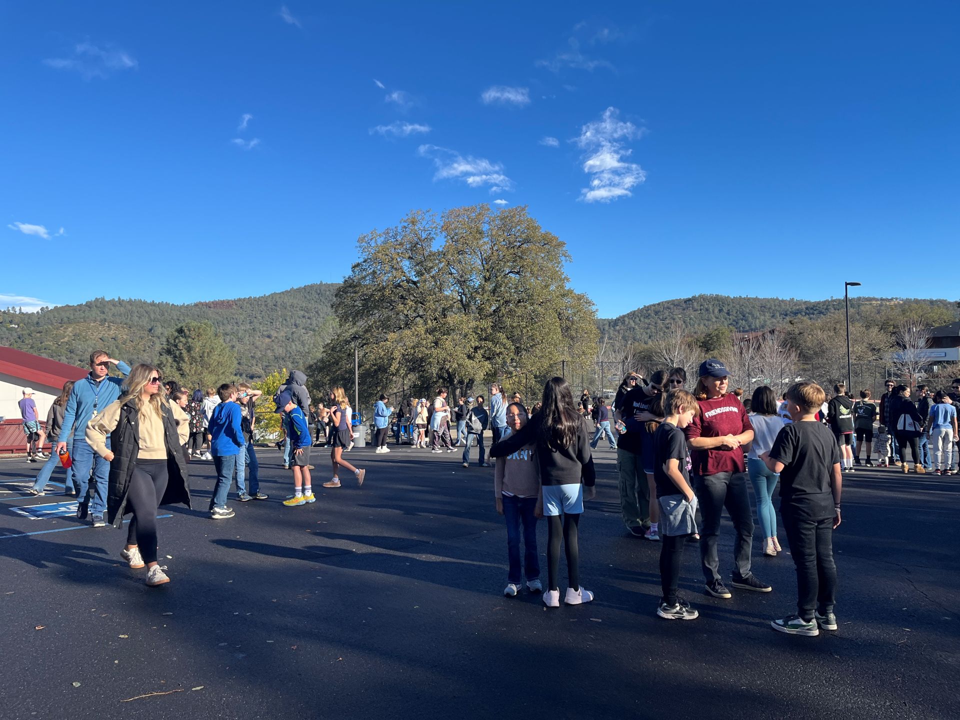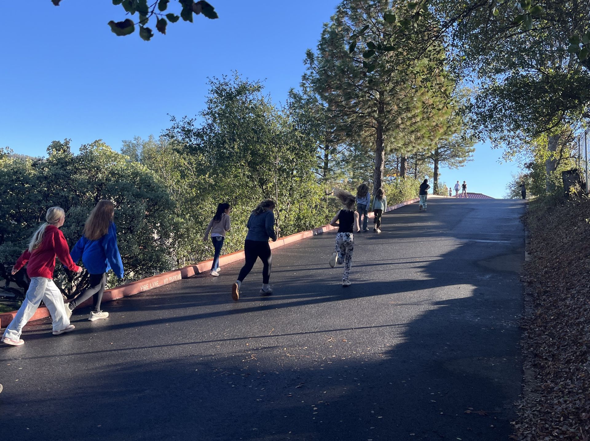 The starting line was set on the blacktop near our new gym. With families on the sideline and music blasting from the speakers, students took off across the field, then down to R12/PE. The biggest challenge followed, up the hill to the A Building, where they were greeted by the enthusiatic cheers of second grade. The excitement continued with first grade cheering at the C Building, and a mix of second grade and kinder at the cafeteria. The home strech curved around the cafeteria, and along the D Building to the finish line, where crowds were waiting with high fives for everyone.